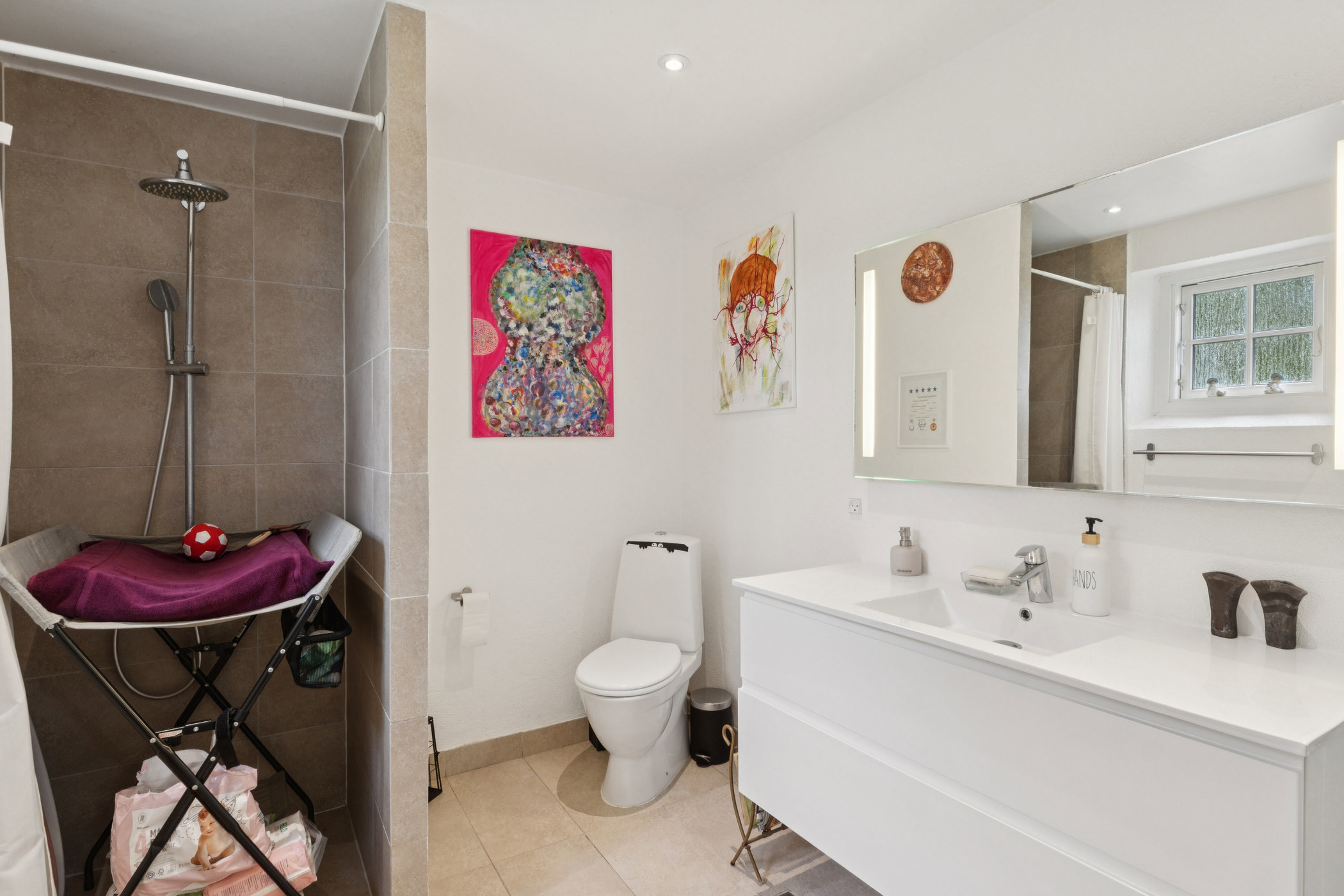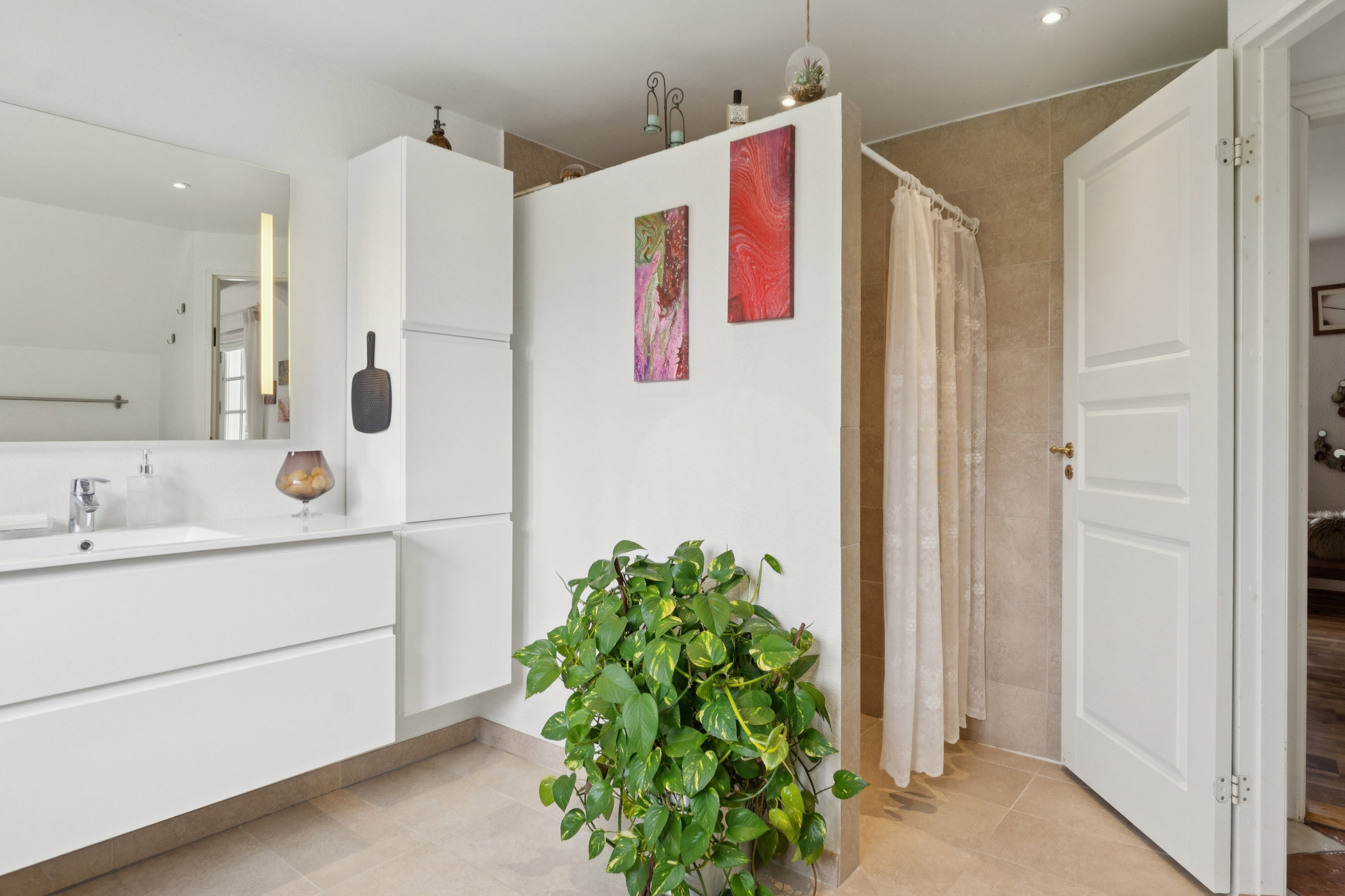 Videre fra entreen er der 2 store flotte badeværelser, begge med bruseniche, hyggeligt køkken med god spiseplads hvor udsigten over haven kan nydes og med udgang til terrassen.