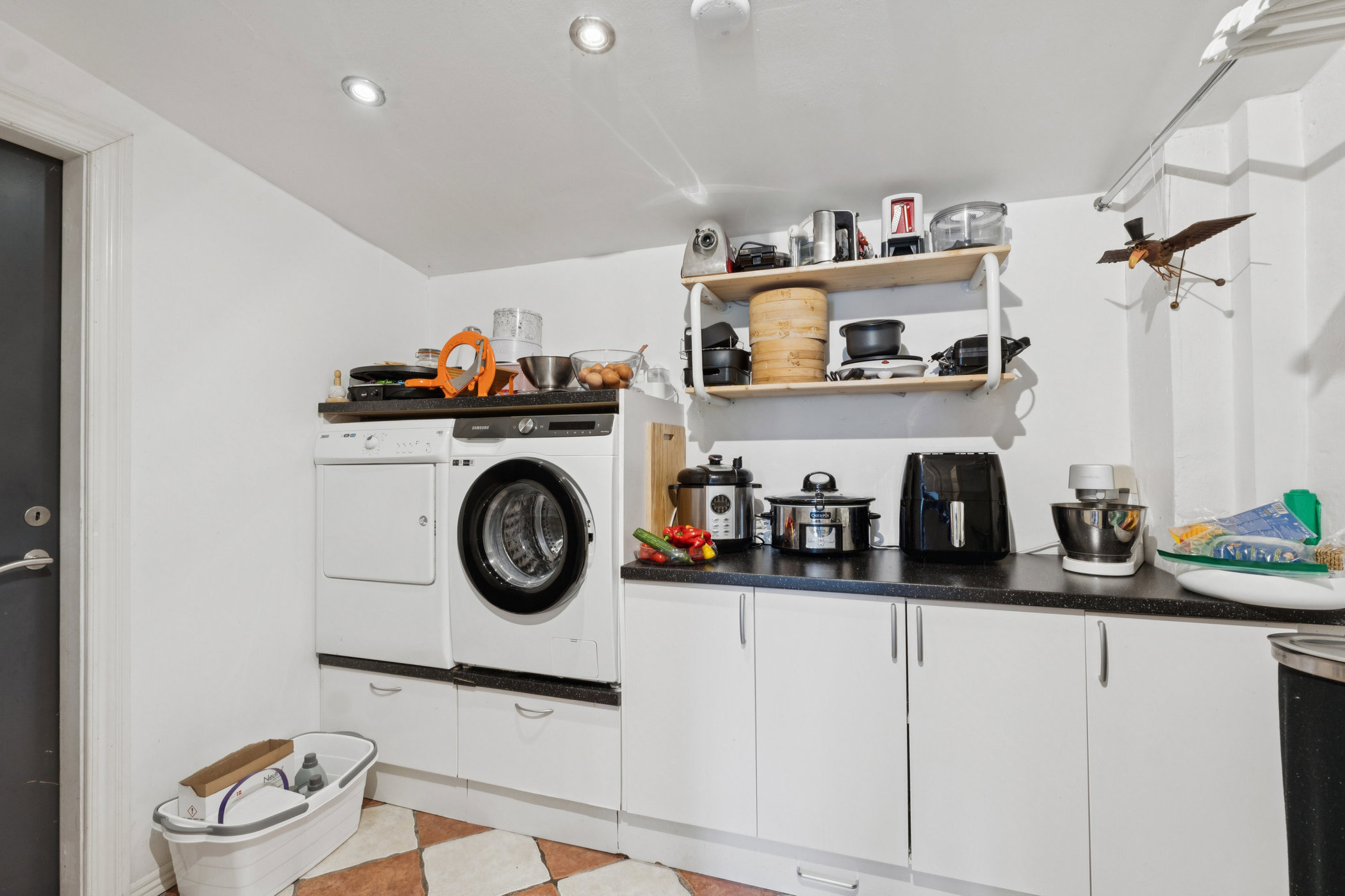 Fra køkkenet er der også adgang til en baggang/vaskerum med plads til vaskemaskine og tørretumbler. Baggangen fører videre til fyrrummet med pillefyr og fra fyrrummet er der direkte adgang til garagen.