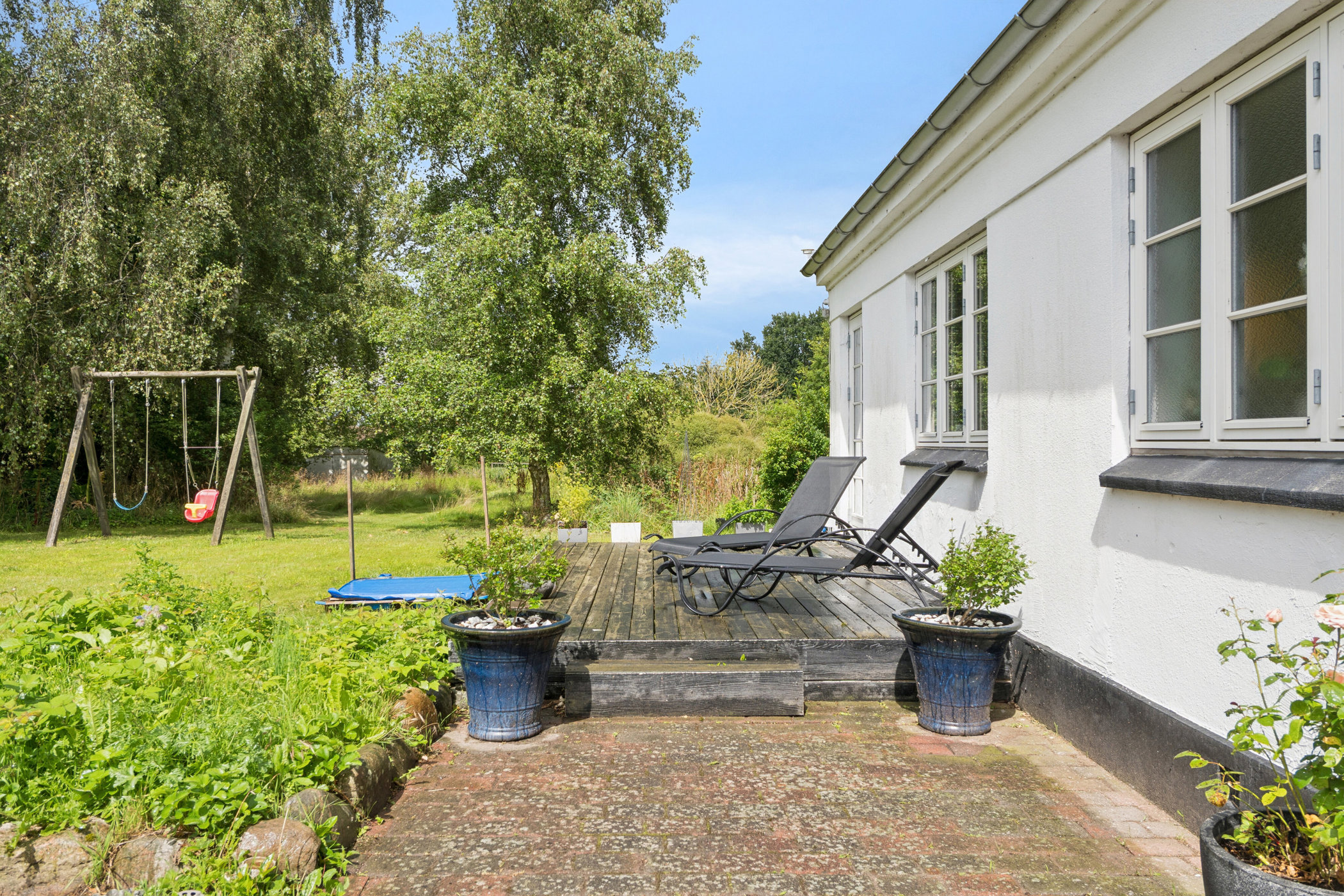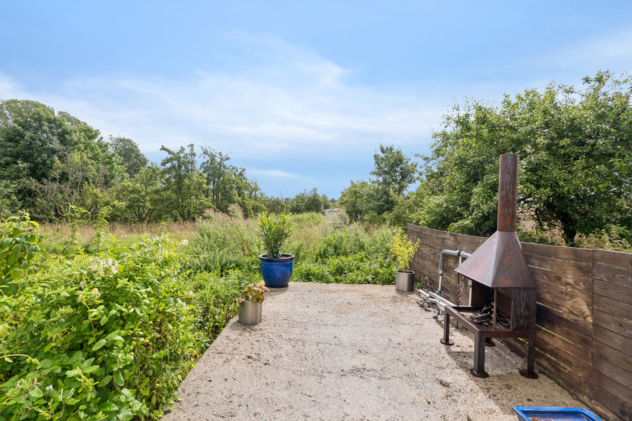 Her er god plads til leg, terrassemiljø og udeliv. Haven har mange gamle frugttræer. Den er ‘Vild med vilje’ og er derfor nem at passe. Vi har aldrig brugt gift. Haven har også en smuk beskyttet sø.