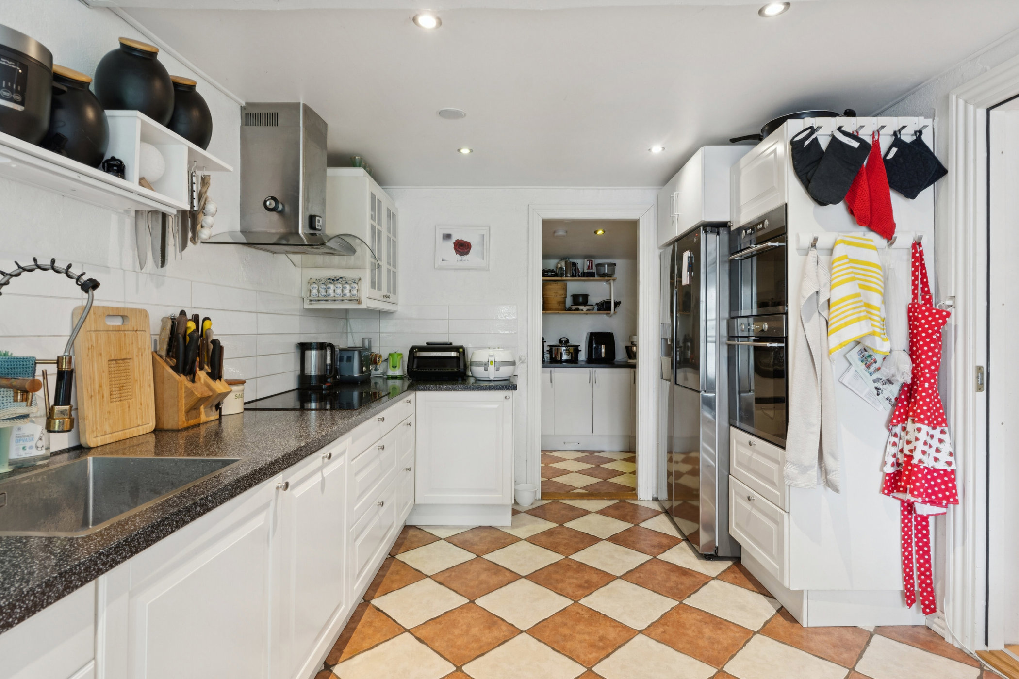 Videre fra køkkenet er der en fordelingsgang med stort værelse, walk-in garderobe og til den store gildesal (ikke en del af boligarealet). Fra gildesalen er der udgang til begge terrasser.