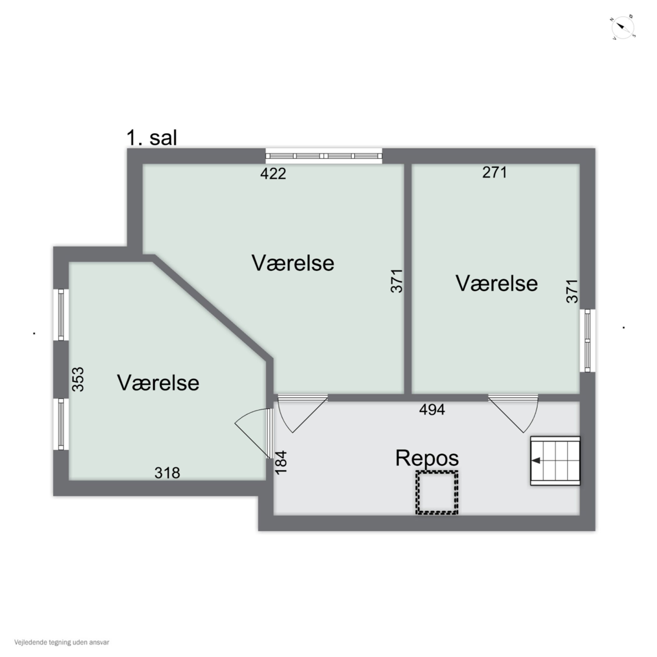 På 1. salen er der repos, 1 værelse med den skønneste udsigt over haven og søen, 1 værelse med en fantastisk udsigt over marker og 1 værelse med udsigt til haven.